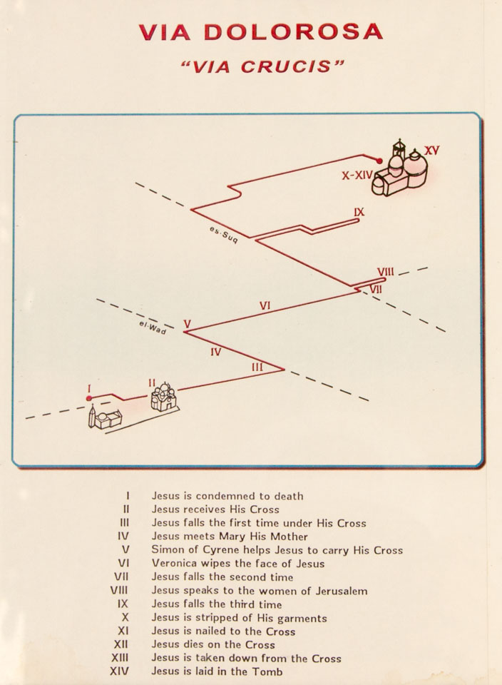 イエスの処刑からおよそ二千年後の現在の地理上では、ヴィア・ドロローサの始発点はエルサレム旧市街北東のイスラム教地区にあるライオン門付近、終着点は旧市街北西のキリスト教地区の聖墳墓教会内にあるイエスの墓に相当する。その間、始発点と終着点を含めた計十四箇所に留(りゅう)と呼ばれる中継点が設けられており、第9留までが旧市街の入り組んだ路地の途中に、残りの五つが聖墳墓教会の内にある。(Wikipedia:ヴィア・ドロローサより)