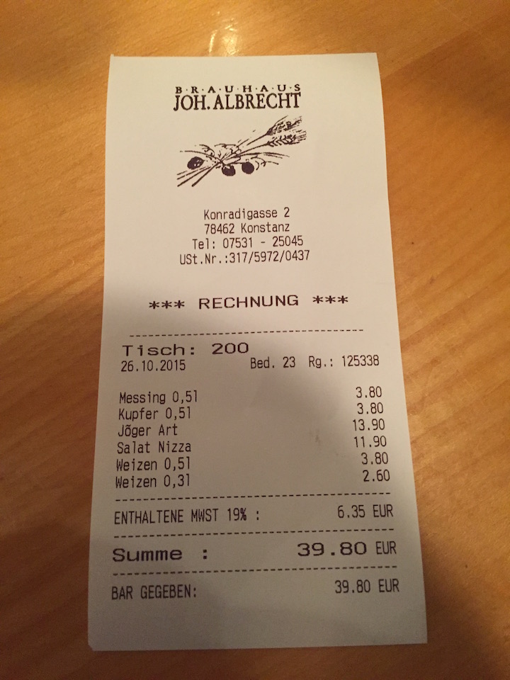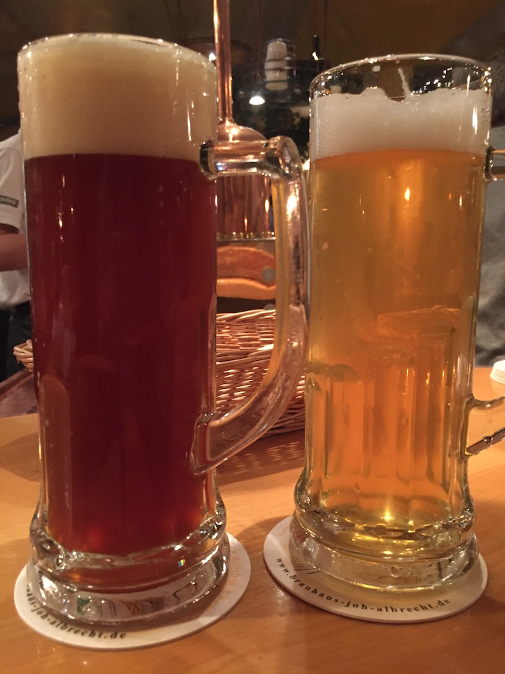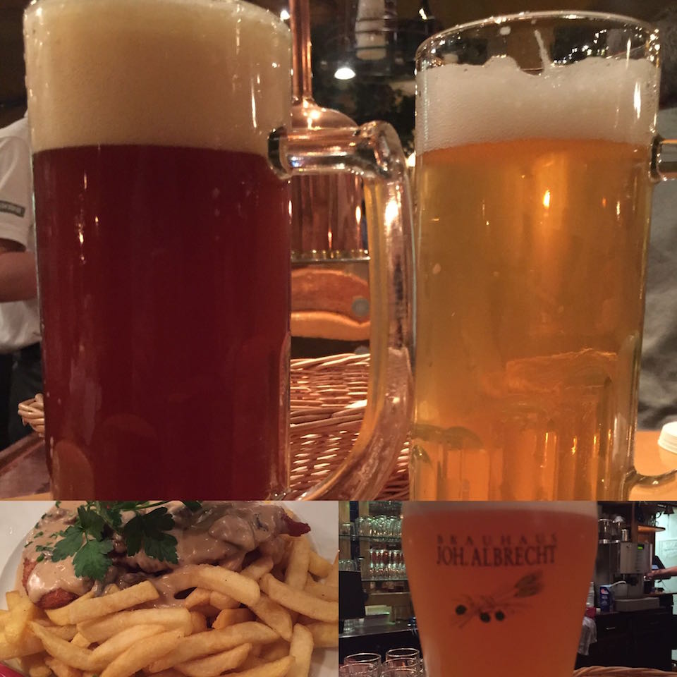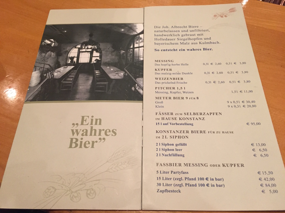 やっぱり安い!いずれの種類も0.5リッターでも3.8ユーロくらいなので500円くらい。ビールの種類は、このメニュー表から推測するに、IPAタイプのMESSING、ドゥンケルタイプのKUPFER、そしてヴァイスビアWEIZEN BIERが用意してあるようです。我々は最初にMESSINGとKUPFERを頼みました。