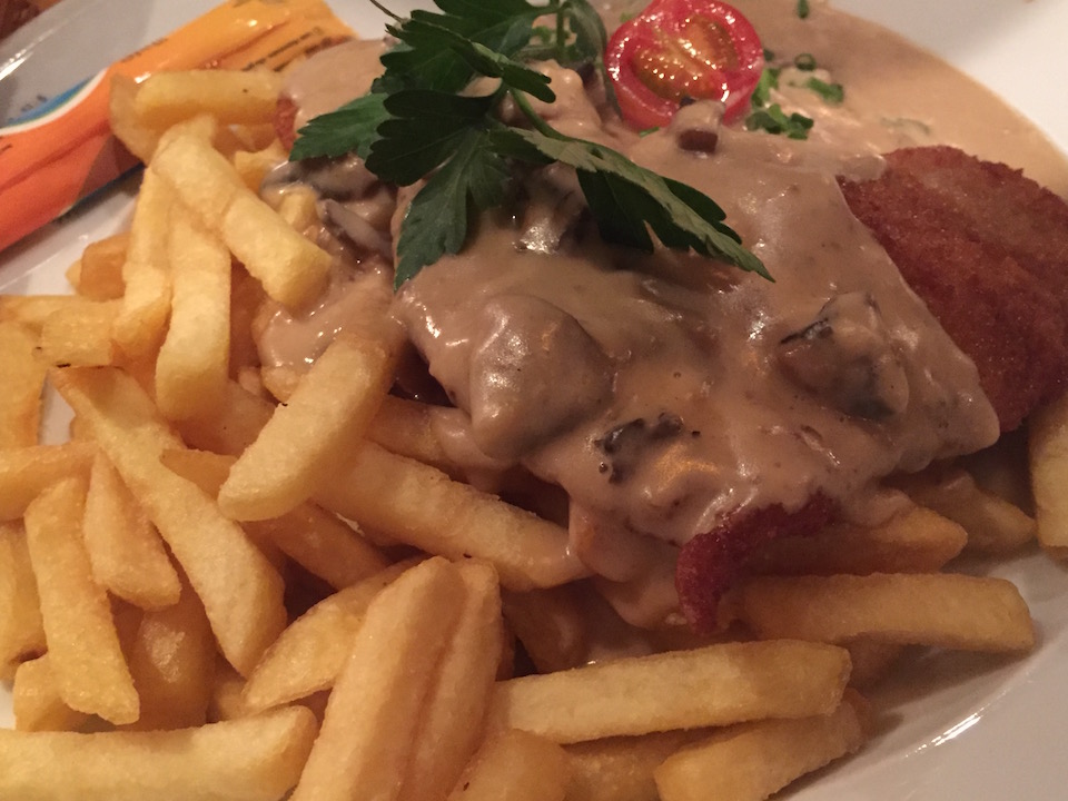 And for the main course, we had Jägerschnitzel. This one is a typical German dish in reverse.