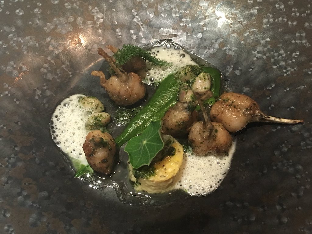 そしてその次に出てきたのは[highlight]「カエル」[/highlight]。さっぱりとした鶏肉のような食感ですが、もしかするとある程度油も乗っていたのかもしれません。ソースは、さっぱりとはしていますが確かな味わいの生クリームとバター、そしてバジルを主体としたものでした。