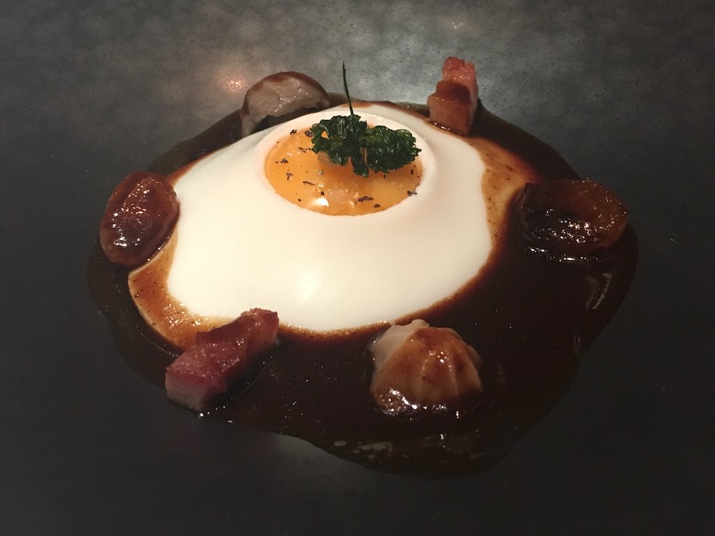 そしてメインの前にもう一つ前菜が。[highlight]「卵のムーレット」[/highlight]です。ブルゴーニュ風ポーチドエッグといったところでしょうか。卵を赤ワインソースに落として煮るブルゴーニュの伝統料理のひとつ。