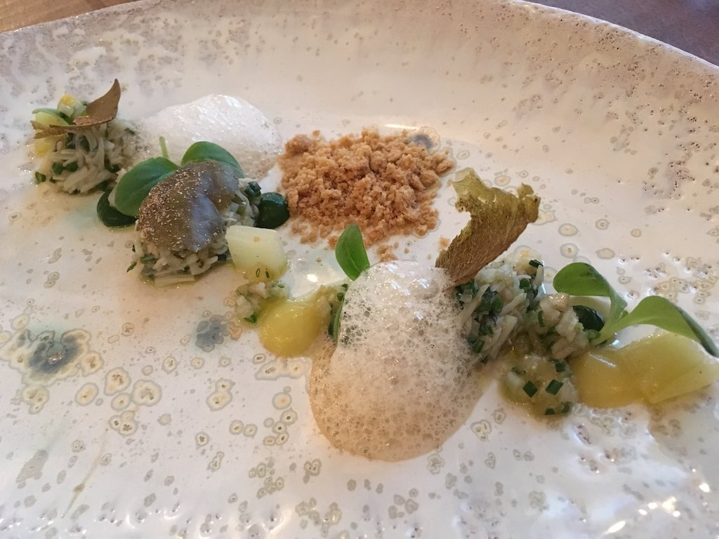 1 dish: Araignée de Mer en émiettée à la Cardamome, Côtes de Blettes au Citron et Emulsion Corail