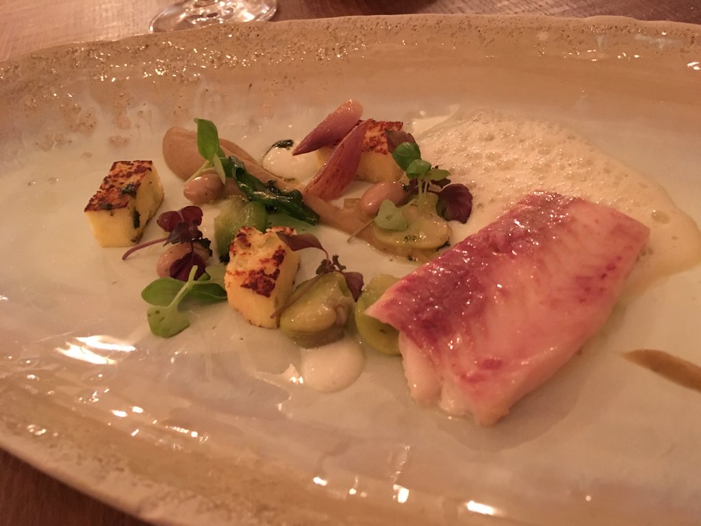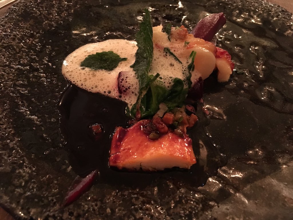 Next came the foie gras. The foie gras is on the bottom left of the photo. The garnish was a mushroom called royal champignon, which you can see in the upper left. And what is the one on the top? I can’t remember. From the menu, I can decipher that it’s a turnip (Rave) puff? Or Cul Noir, something made with pork lard?
