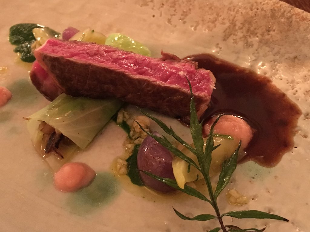 And finally, finally? The meat dish appeared. Charolle beef entrecote. It’s a French beefsteak. By the way, entrecote is the opposite part of fillet, so it is also called contre-filet. It is a very luxurious dish. Armoise is so-called mugwort, Chou Cabu is cabbage, and the sauce was fond de veau and red wine sauce.