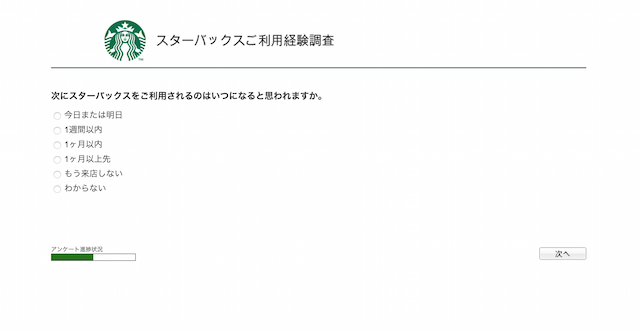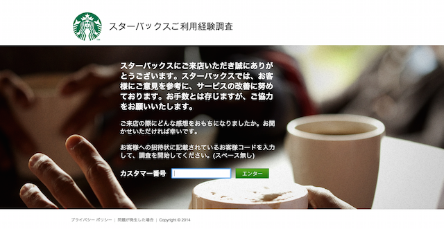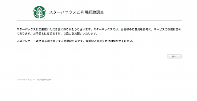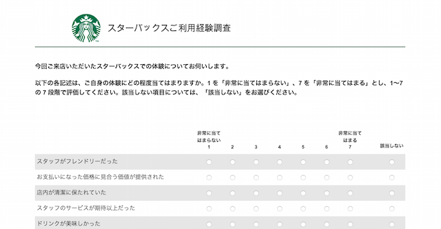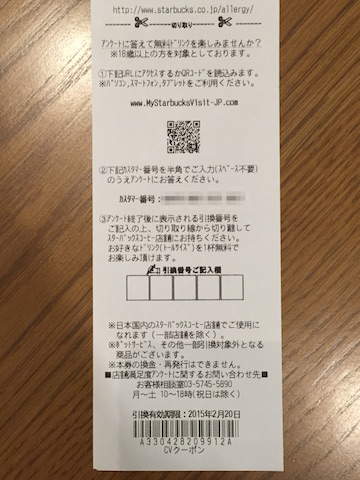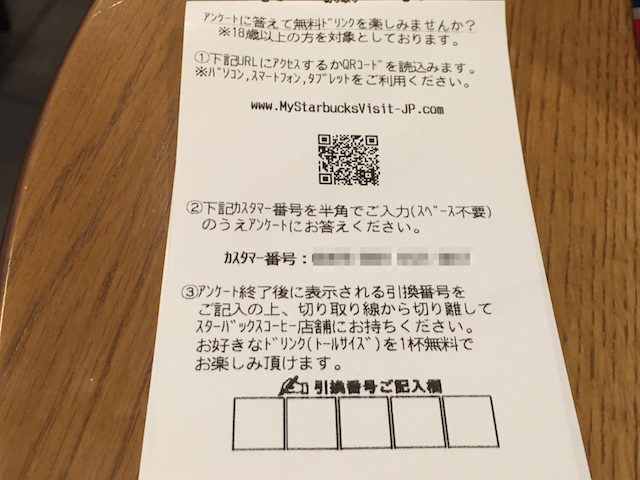 時々ランダムにこのようなレシートが印刷されて、ここの記載のURLにアクセスしアンケートに回答すると、好きなドリンクのトールサイズが無料で1杯もらえるというクーポンをゲットできるんです。やったね、朝からついてる。