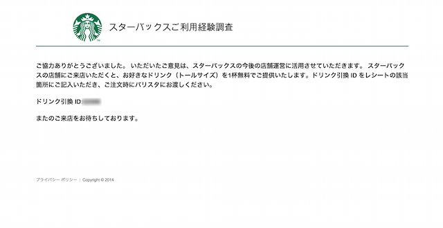 すべてのアンケートに回答すると、「ドリンク交換 ID」が表示されるので、これを先ほどもらったレシートに記入して完了。