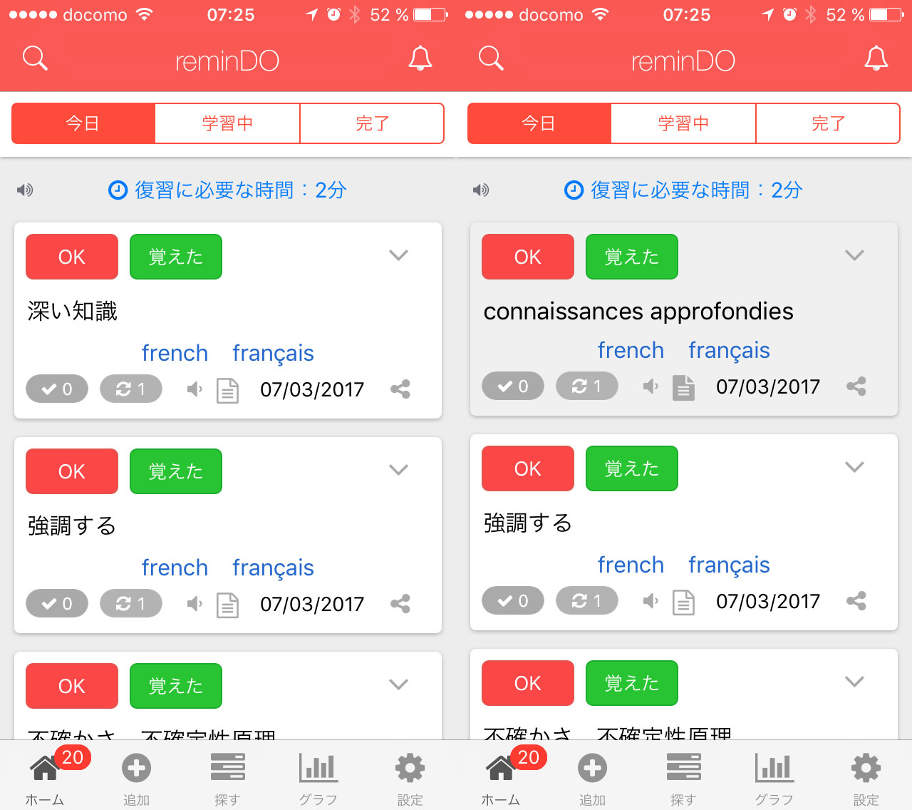 In addition, each of them has three buttons: “OK (for now)”, “Learned”, and “Learn Again”, which you can press as needed to manage your progress. Depending on how much you press these buttons, your status will change, and you’ll automatically be sorted into one of three lists: “Today”, “Learning”, or “Complete”.